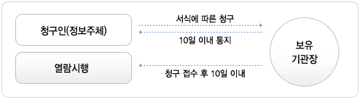 청구인 정보주체가 서식에따른 청구를 하면, 보유기관장은 10일이내 청구인(정보주체)에게 통보한다. 보유기관장이 청구접수 후 10일 이내 열람을 시행한다. - ○ 개인정보파일은 「개인정보 보호법」제35조(개인정보의 열람)에 따라 자신의 개인정보에 대한 열람을 요구할 수 있습니다. 다만, 개인정보 열람 요구는 법 제35조 5항에 의하여 다음과 같이 제한될 수 있습니다.